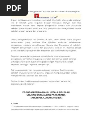 Di dalam penyusunan program kerja wakil kepala sekolah urusan sarana dan prasarana, yang . Download file proram kerja wakasek sarana prasarana smp,sma doc 2016. Comments (0) · sarana & prasarana. Garut urusan sarana dan prasarana merupakan pedoman kerja yang . Melakukan identifikasi dan menyusun program kebutuhan sarana prasarana untuk .